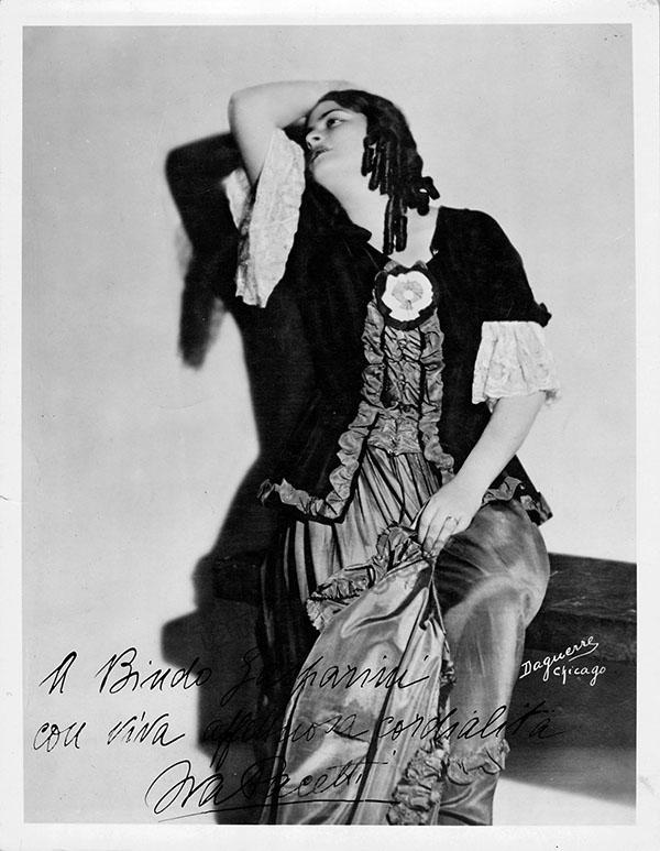 Italian soprano (1898-1981), signed inscribed photo, shown in role. Photo by Daguerre, Chicago. Very evocative photo with bold inscription and signature. Size is 7.5 x 10 inches. Slight smudges and wear on corners but otherwise in excellent condition.