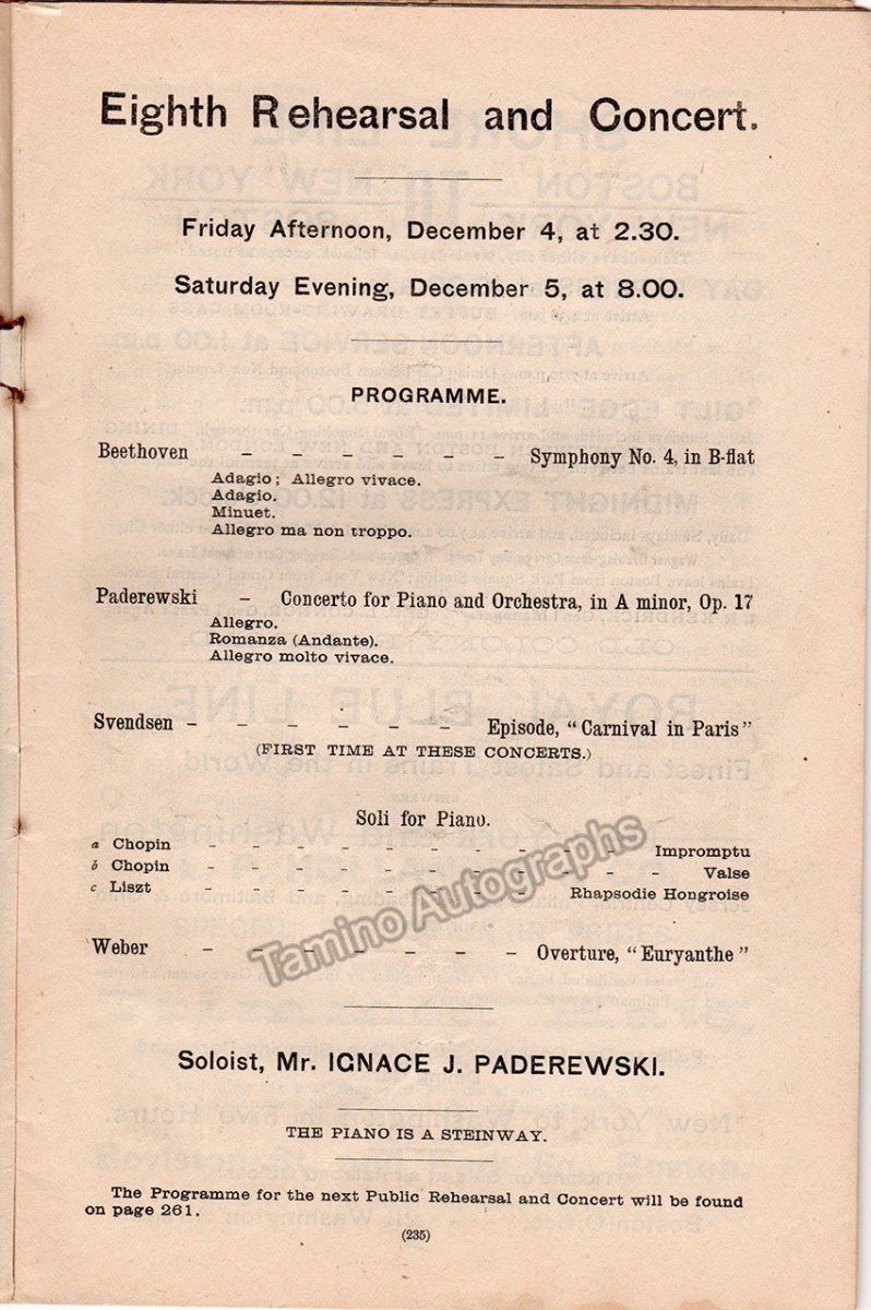 Program December 4th and 5th, 1891. Conductor : Arthur Nikisch. Soloist : Ignace Paderewski. Beethoven – Paderewski: Piano concerto – Svendsen – Chopin & Liszt : soli for piano – Weber.Full page announcement: December 18th and 19th, 1891. Arthur Nikisch. Soloists : Emma Fursch-Madi & Franz Kneisel. Mozart. (200th anniversary concert of the death of Mozart). Full page announcement : Symphony Orchestra of New York. Conductor : Walter Damrosch. Soloist : Ignace Paderewski. Tchaikovsky Symphony n° 2, Rubinstein, Gluck, Chopin, Liszt, Wagner. 36 pages, full program with all pages and covers, many illustrations, excellent condition