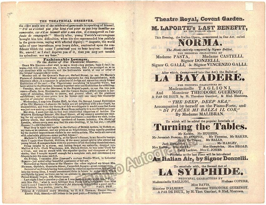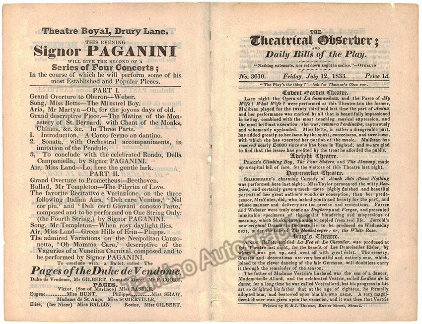 Four-page leaflet, entitled "The Theatrical Observer and Daily Bills of the Play", London, 1833, with a full page announcement for an upcoming series of 4 concerts by Nicolo Paganini at the Theatre Royal, Drury Lane. Leaflet also has comments on the final performance of Maria Malibran the night before, and her total payment of 4000 pounds for her tour, and that a profit was made for the house.