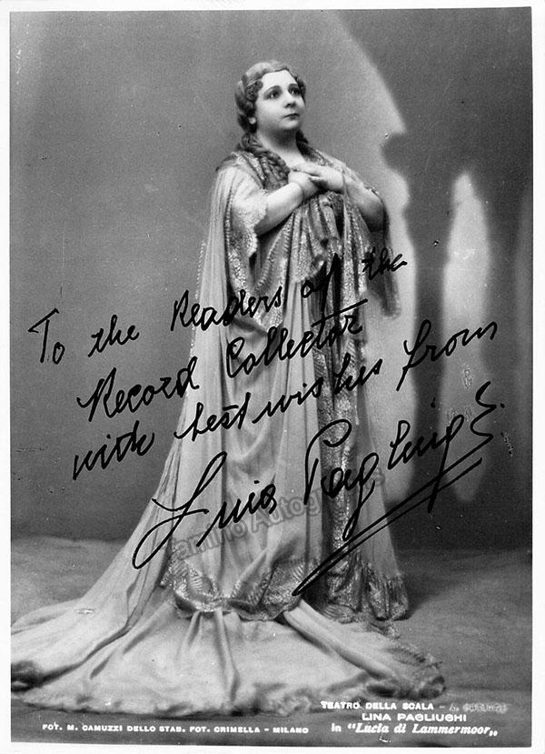 Italian soprano (1907-1980), signed and inscribed photo, shown in title role of Lucia di Lammermoor. Photo is by M.Camuzzi, Crimella Photos, Milan. Size is 4.25 x 5.75 inches, in excellent condition.