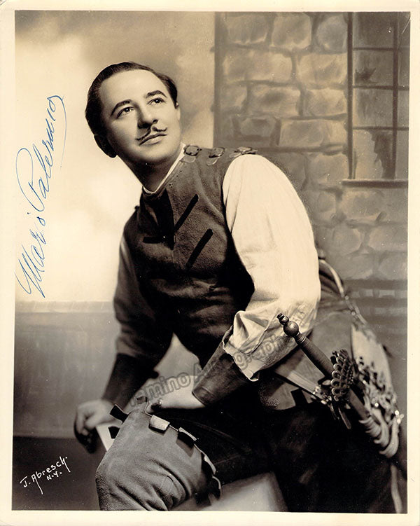 Tenor active with the touring San Carlo Opera Company in the 1930s and 40s. Signed photograph, shown in role. Bold handwriting and signature. Stamped on verso by photographer James Abresch, New York. Size is 8 x 10 inches, in very good condition.