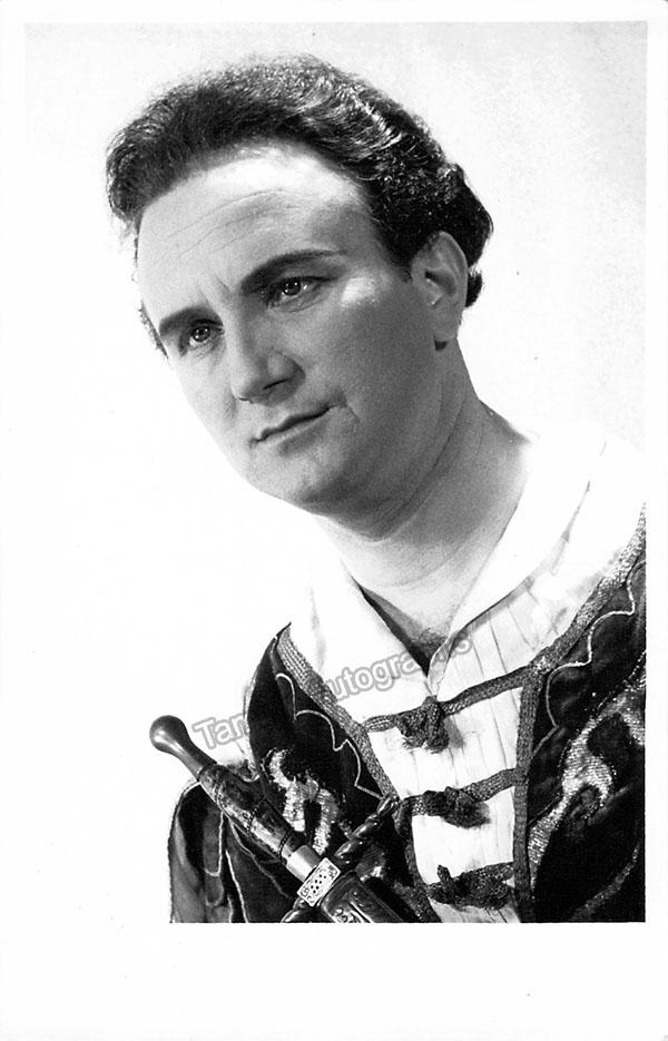 Hungarian tenor (1917-1997).  Signed photo, shown as Manrico in Verdi's Il Trovatore, dated in 1964. Inscription and signature on verso. Size is 3.5 x 5.5 inches, some bending and wear on edges but otherwise in good condition.