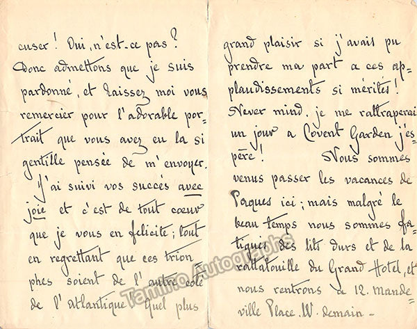 Autograph letter signed by him, written in French (sold untranslated), dated April 8th, 1896, with the letterhead of a hotel in England. Size is 5 x 8 inches, 4 written pages in one sheet, rust stains over the borders, folds, small crack, otherwise in very good condition.