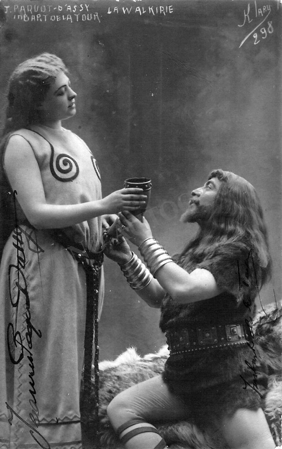 Belgian soprano/mezzo-soprano (1878-1952) and French tenor (1865-1911), double signed photograph, shown as Sieglinde and Siegmund in Wagner's Die Walkure. Photo by Klary, Brussels. Size is 3.5 x 5.5 inches, in very good condition.