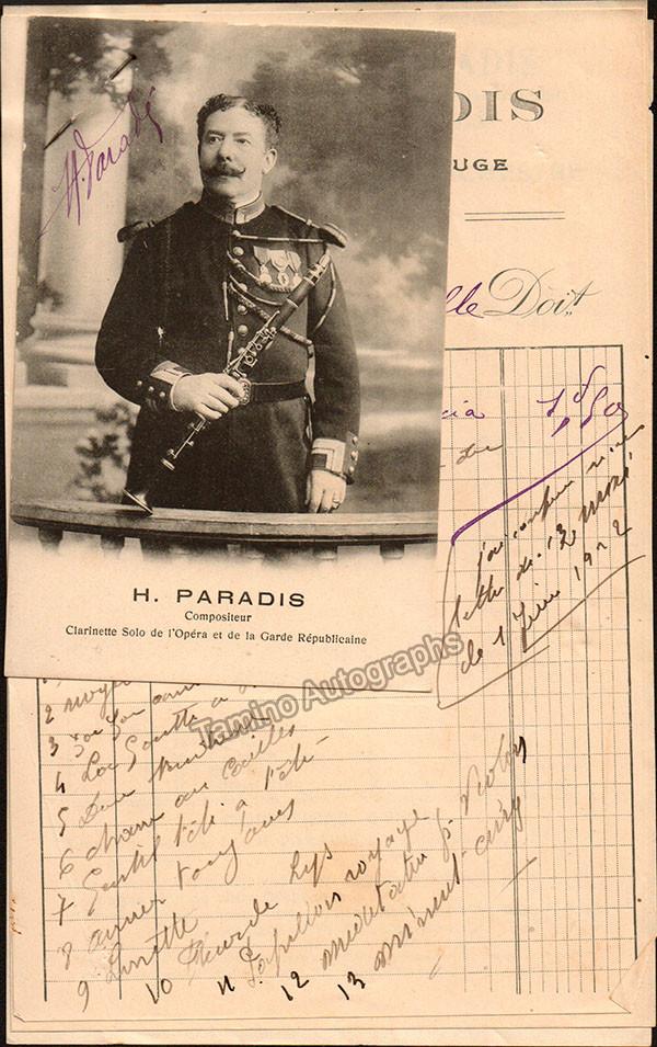 French clarinetist and composer (1861-1940), soloist at the Paris Opera for 43 years. Signed photo postcard, hand written on verso. Also included are some handwritten notes, with his letterhead. Size is 3.5 x 5.5 inches.