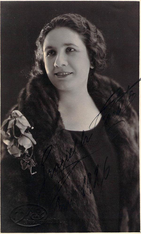 Spanish soprano (1889-1973), one of the leading coloratura sopranos during the inter-war years. Signed photo postcard, shown as herself. Blind stamped by photographer Bixio. Size is 3.25 x 5.25 inches, slight silvering, otherwise in excellent condition.