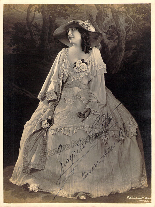 Spanish soprano (1889-1973), one of the leading coloratura sopranos during the inter-war years. Signed photograph, shown in role (possibly Violetta in Verdi's La Traviata), dated in Buenos Aires in 1926. Printed photographer signature on front. Size is 7 x 9.25 inches, in very good condition.