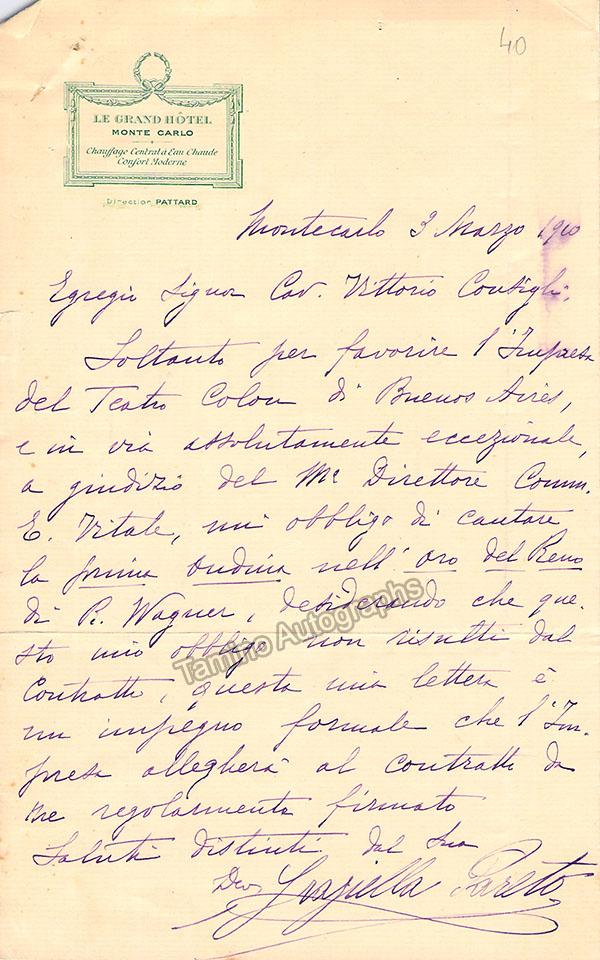 Autograph letter signed, dated in 1910, 1 page, written on the letterhead of the Grand Hotel, Monte Carlo, written in Italian, sold untranslated. Size is 5.25 x 8.5 inches, in beautifully preserved condition.