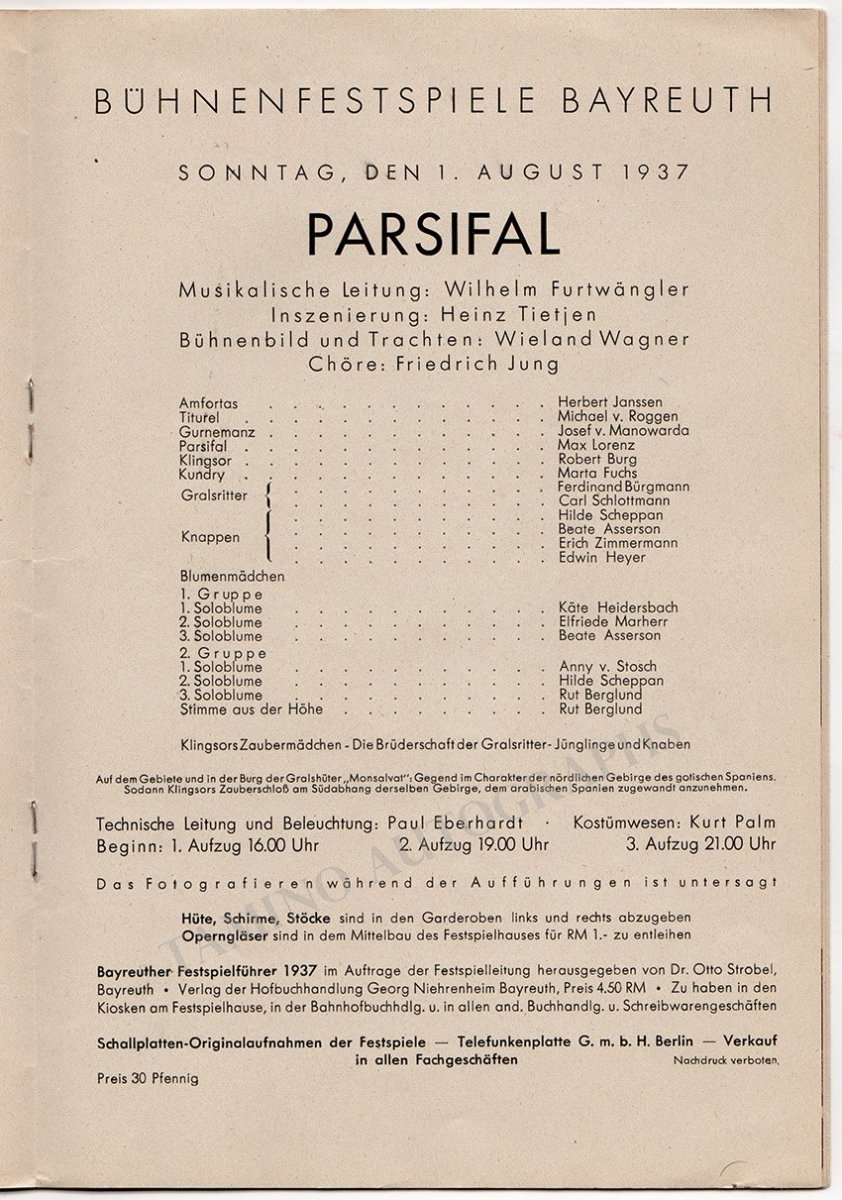 Full program, August 1st, 1937 performance of Parsifal with Wilhelm Furtwangler conducting, cast includes Herbert Janssen, Josef Manowarda, Max Lorenz, Marta Fuchs, etc. Size is 6.5 x 10 inches, complete, in excellent condition