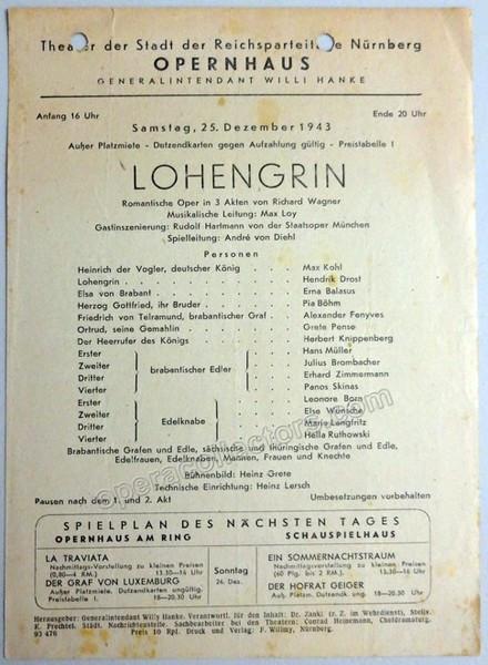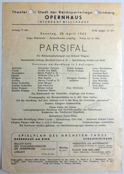 Two programs of Wagner performances in the City of the Reichsparteitage Nurnberg, 1943. Lohengrin, 25 December 1943. Parsifal, 25 April 1943. 1 sheet each, Rare documents from the Nurnberg Opera during WWII