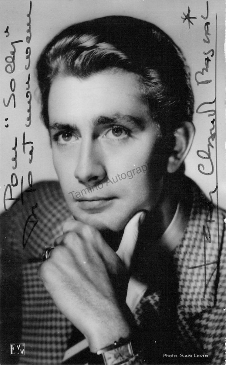 French comedian and singer (1927-1992), active in films between 1951-1985.  Fine black and white photo postcard signed and inscribed by him with a short sentiment.  Size is 3.4 x 5.5 inches, in excellent condition.