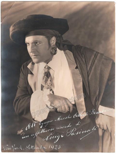 Large size photo signed by the Italian tenor, shown as Don Jose in Carmen. Inscribed to composer and conductor Alberto Bimboni, dated in New York in 1925. Size is 10 x 13.25 inches, minor cracks on borders, otherwise in excellent condition.