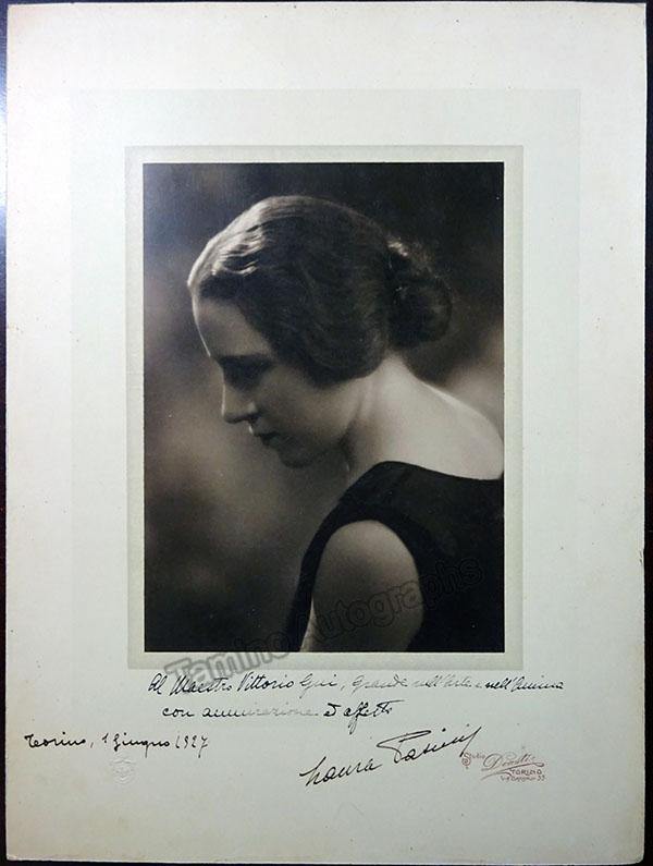 Large photograph shown as herself, signed and inscribed by her with a short sentiment to the Italian conductor Vittorio Gui, dated in Turin, 1927.  Photo is mounted on a photographer mat by Studio Deazti, Turin.  Total size is 11.75 x 15.5 inches, actual photo is 6.6 x 8.9 inches, even age-toning, minor water stains over the lower border, in very good condition.