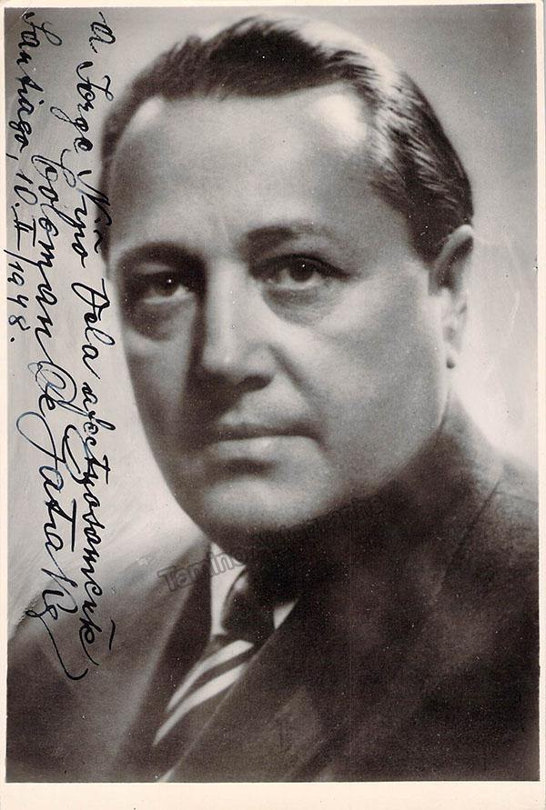 Hungarian tenor (1896-1964), signed photograph, shown as himself, inscribed in Santiago and dated in 1948. Stamped on verso by photographer Carmen. Size is 4.5 x 6.275 inches, in very good condition.