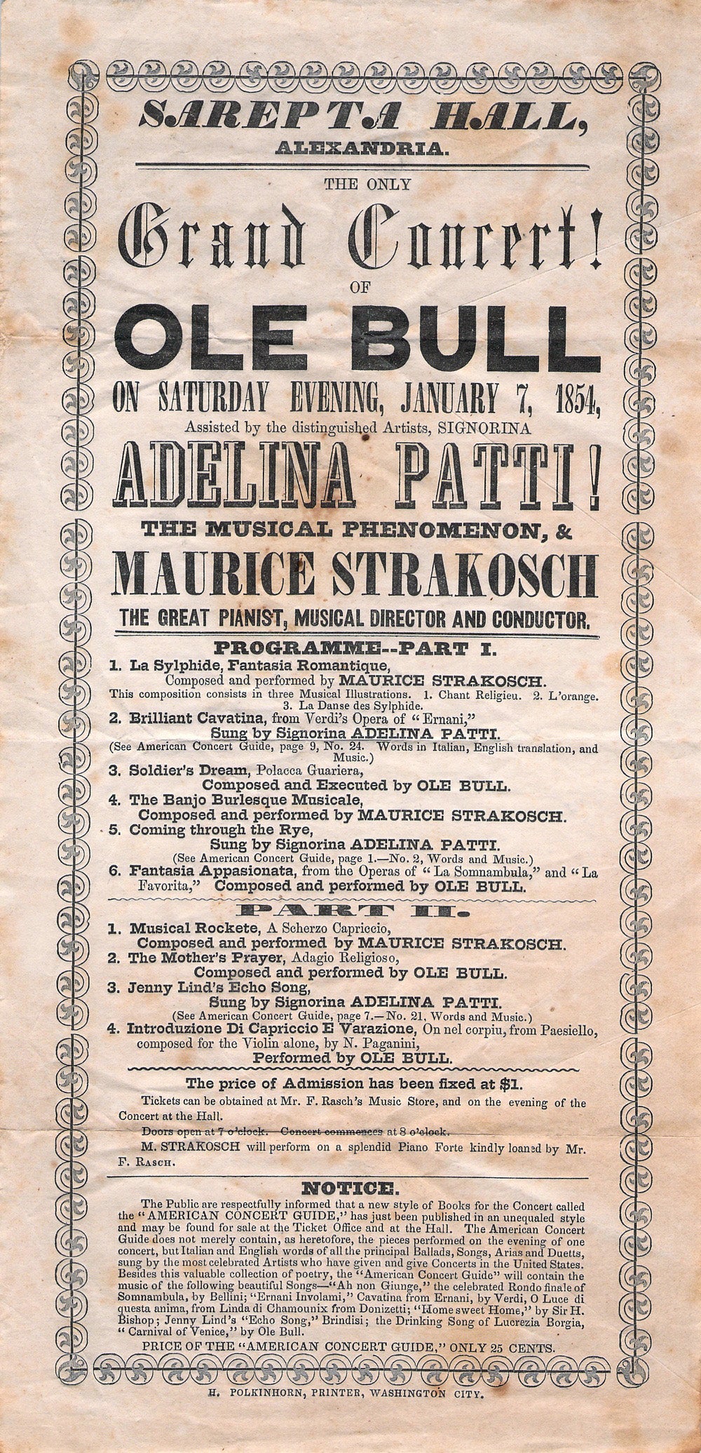 Very rare playbill for a concert in Alexandria, Virginia, on January 7th, 1854, featuring Adelina Pati ("the musical phenomenon"), not yet 11 years old, singing with famous Norwegian violinist Ole Bull.