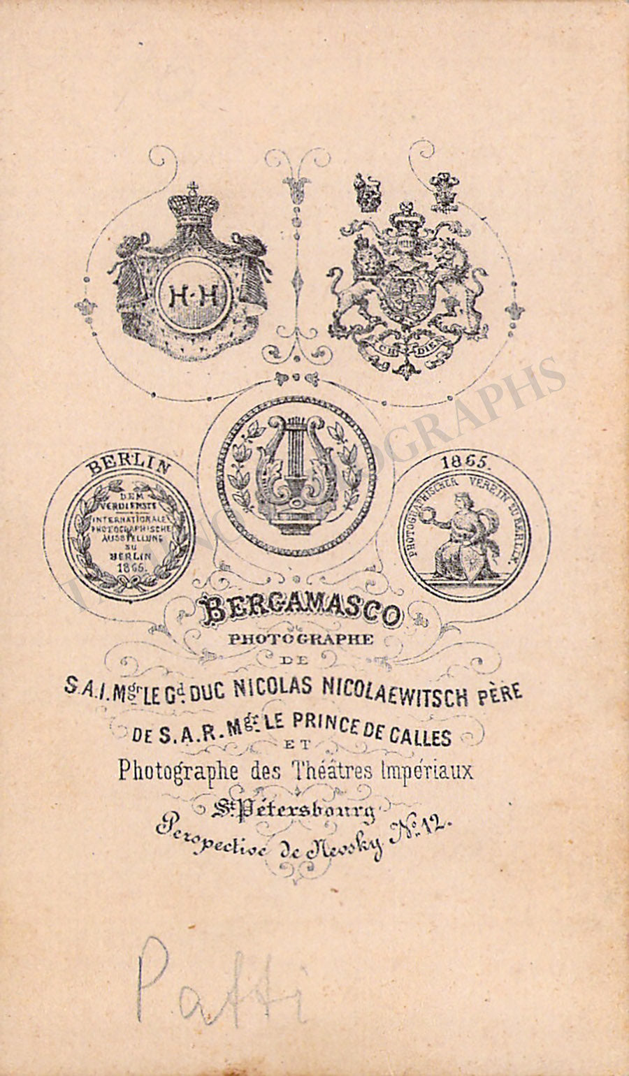 Unsigned CDV, shown as herself, photo by Bergamasco, St. Petersburg. Size is 2.4 x 4.1 inches, pencil markings on verso, otherwise in excellent condition.