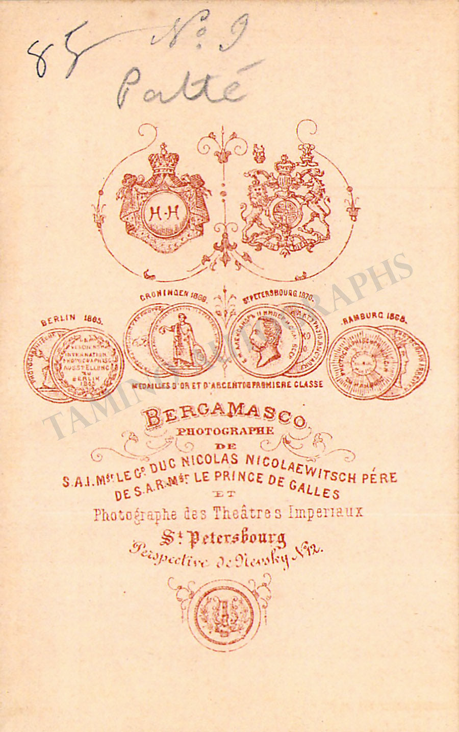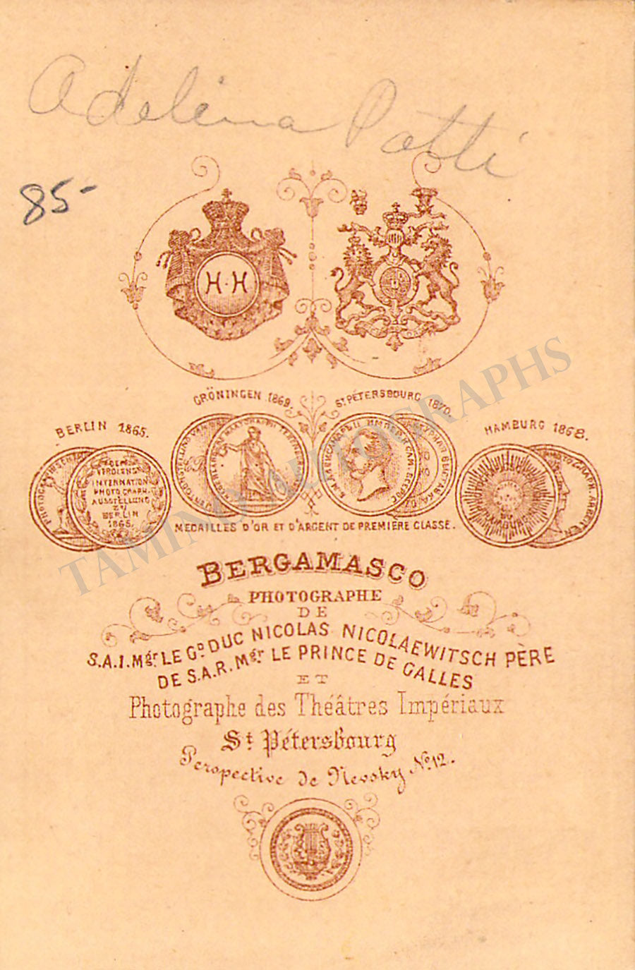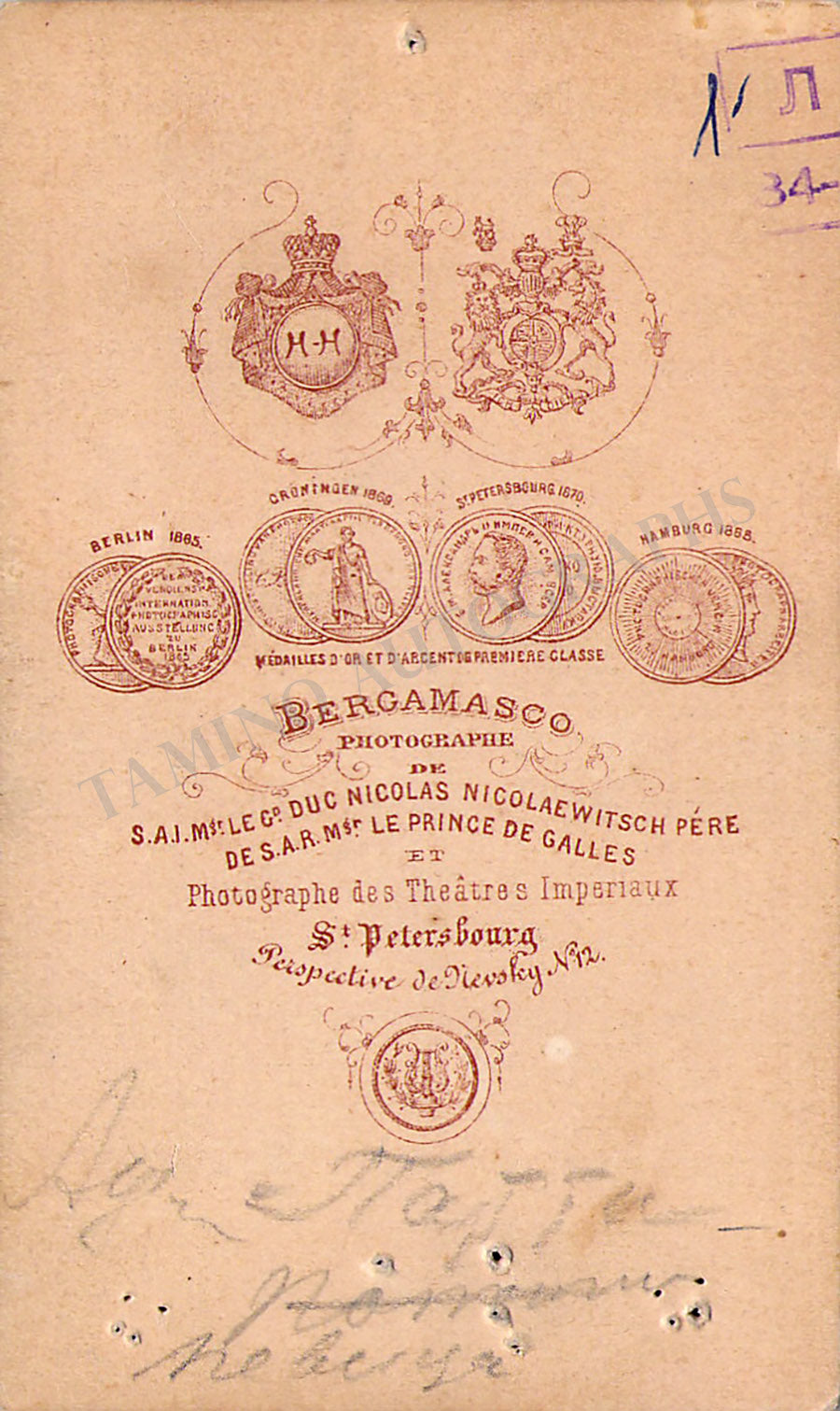 Unsigned CDV, shown as herself, photo by Bergamasco, St. Petersburg. Size is 2.4 x 4.1 inches, small bullet holes on the bottom and pencil markings on verso, otherwise in good condition.