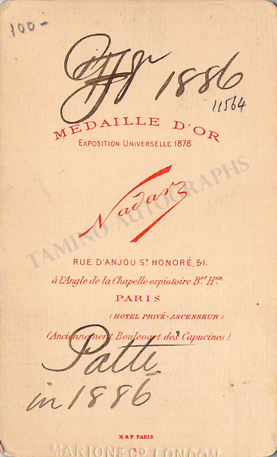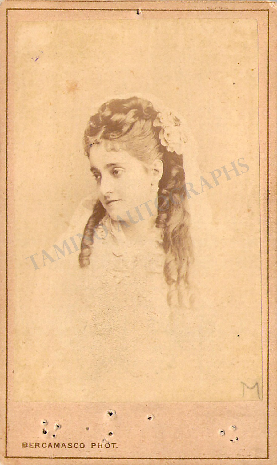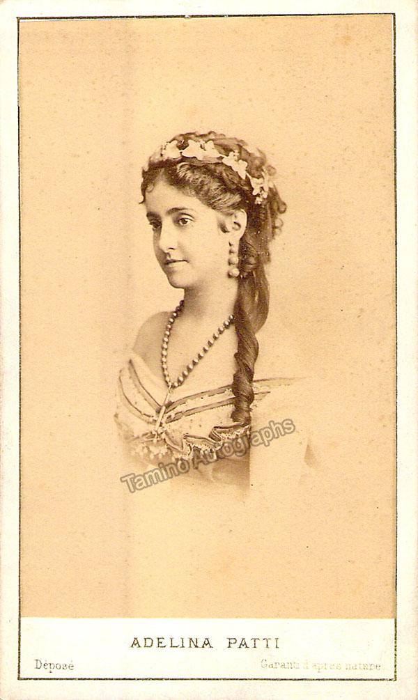 Beautiful black-and-white original carte-de-visite (CDV) of the soprano in her twenties by photographer Reutilinger (Paris). Size is 2.2 x 3.4 inches, some stains on verso, otherwise in very good condition.