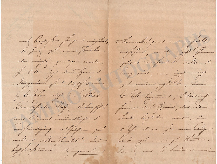 Autograph letter in German signed by him, dated December 11, 1882, where he addresses a gentleman, thanking him for the invitation to take part in a concert and arranging some details for both the music to be sung and the related rehearsals.