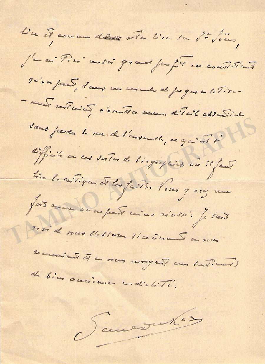 Autograph letter in French (sold untranslated) signed by him, dated Feb. 25, 1925. Size is 4.3 x 5.9 inches each page, 2 written pages in one folded sheet, central fold, in excellent condition.