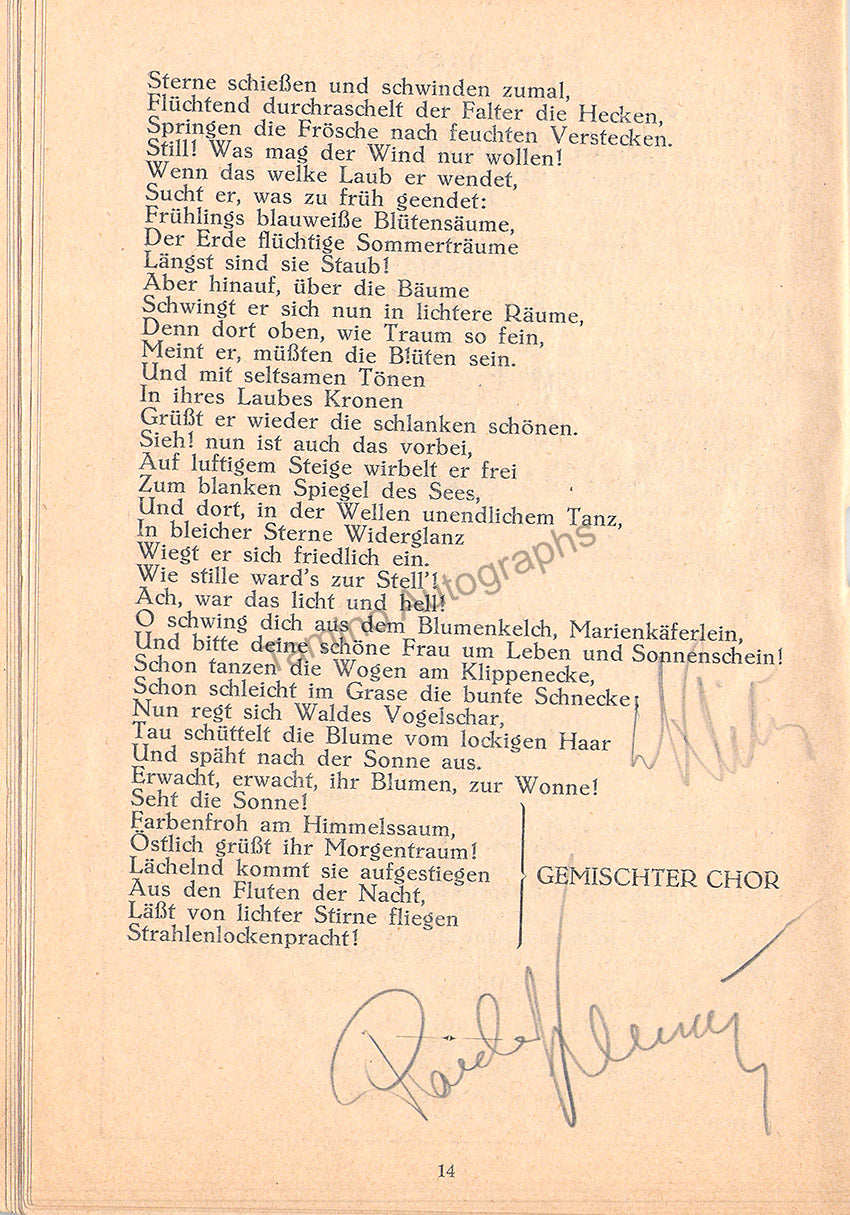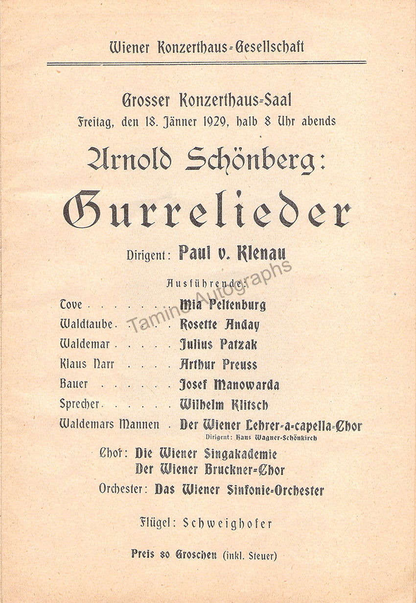 Program for a performance of Schönberg's "Gurrelieder" at the Wiener Konzerthaus, Vienna, on January 18th, 1929, signed by the conductor and Klitsch on page 14 and Peltenburg on page 7.