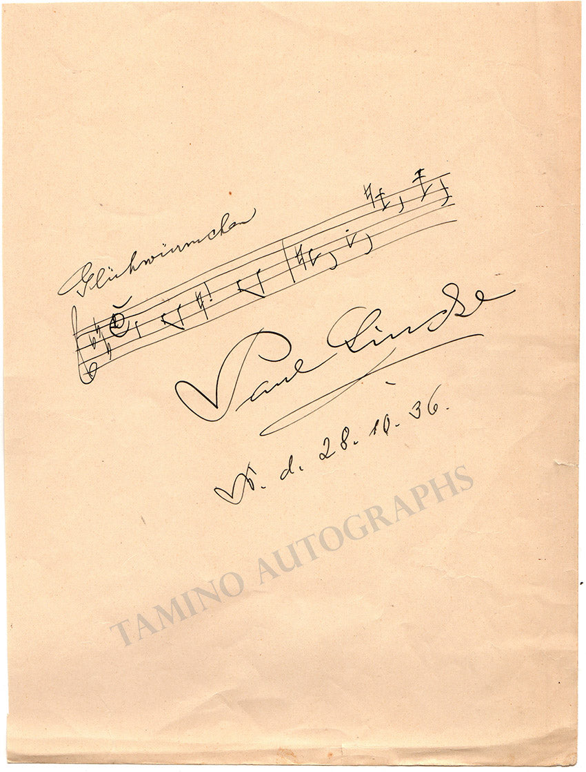 2-bar autograph music quote from his operetta "Lysistrata" (1902) signed by him, dated 1936. Size is 8.5 x 11.25 inches, in excellent condition.