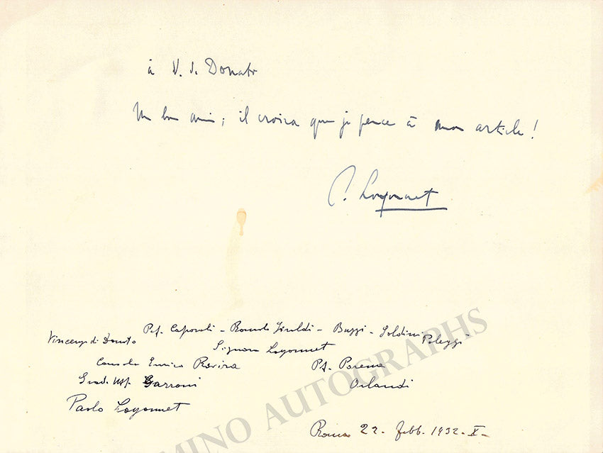 Gorgeous black-and-white photograph signed and inscribed by him on the verso to cellist Vincenzo di Donato (1887-1967) plus a short list of guests, dated in Rome, February 22, 1932, during a gala dinner. Size is 9.3 x 6.9 inches, in excellent condition.