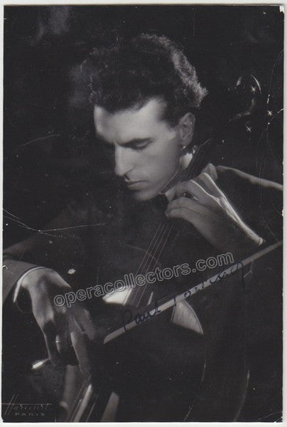 Famous French cellist and composer (1914-1990), signed photo showing him in performance, on double weight paper, 4 x 6 inches. Minor cracks on front, otherwise in great condition