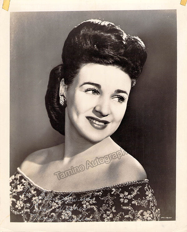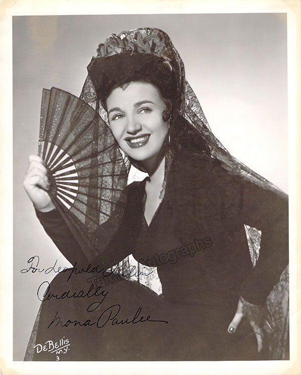 Signed photograph, shown in role in Bizet's Carmen, inscribed. Stamped on verso by photographer De Bellis, New York. Size is 8 x 10 inches, some creases and scotch tape residue on far edges of the photo, otherwise in excellent condition.