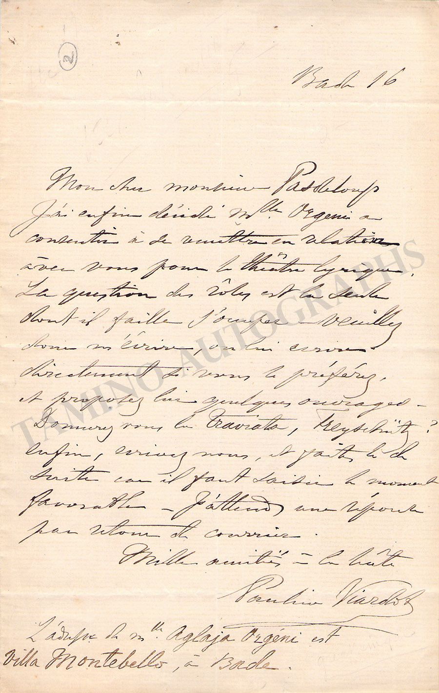 Autograph letter written in French (untranslated) signed by her, no year, where she mentions Verdi's La Traviata and other operas. Size is 5.2 x 8.25 inches, 1 page, in excellent condition.