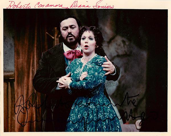 Italian super star tenor (1935-2007), one of the famous Three Tenors and American soprano (b.1946), specialized in verismo and French repertory. Double signed photo, shown in La Boheme at the San Diego Opera. Both dedicated their autograph. Size is 10 x 8 inches. Stamped on verso by photographer Rick McCarthy, in excellent condition.