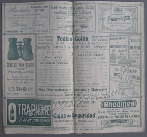 Teatro Colon program, 1917, with Anna Pavlova and her ballet company performing "Gran Divertissement", an arrangement with music by various composers - Also Faust, opera by Gounod, was performed (with Ninon Vallin). Full program, with all pages and covers, in excellent condition, 5.25 x 9.75 inches