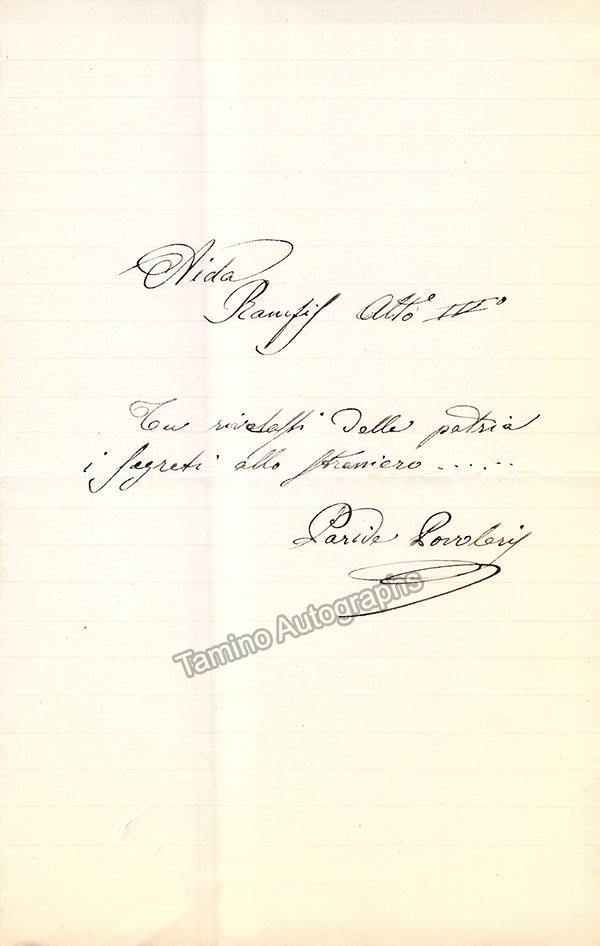 Autograph note signed, with a brief textual quote from the final act of that opera, bold and clear signature, page size is 5 x 8 inches, in excellent condition. Vintage historic item!