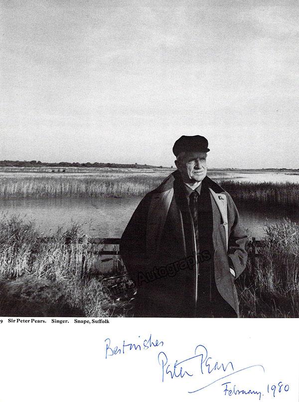 English tenor Peter Pears (1910-1986), who partnered composer Benjamin Britten and premiered many of his operas. Signed photograph, shown as himself, in a pastoral setting, dated in 1980.
