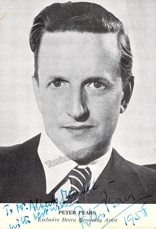 English tenor (1910-1986), who partnered composer Benjamin Britten, with whom he traveled across America singing, putting on shows and recording. He premiered many of Brittens' operas. Signed publicity photo, shown as himself, inscribed and dated in 1958. Size is 3 x 5 inches, in excellent condition.