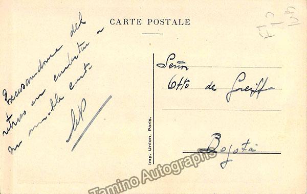 Uruguayan composer (1878-1941), guitarist and educator. He was mostly known for his music for classical guitar, operas and ballets. Signed postcard with a portrait of him, inscribed and dated in 1939 (he also wrote on verso). Size is 3.5 x 5.5 inches, in excellent condition.