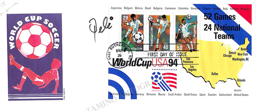 First-day cover for the release of stamps commemorating the USA FIFA Worldcup 1994 issued on May 28, 1994, signed with a black felt tip pen by the Brazilian star in its original envelope.  Size is 9.4 x 4.1 inches, in excellent condition.
