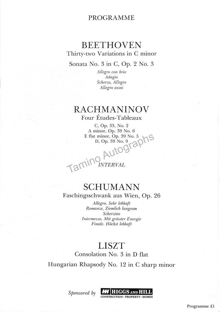 Program for a piano recital of music by Beethoven, Rachmaninoff, Schumann, and Liszt, at the Royal Festival Hall, London, on May 15th, 1989, by the American pianist, signed by him on his bio page.