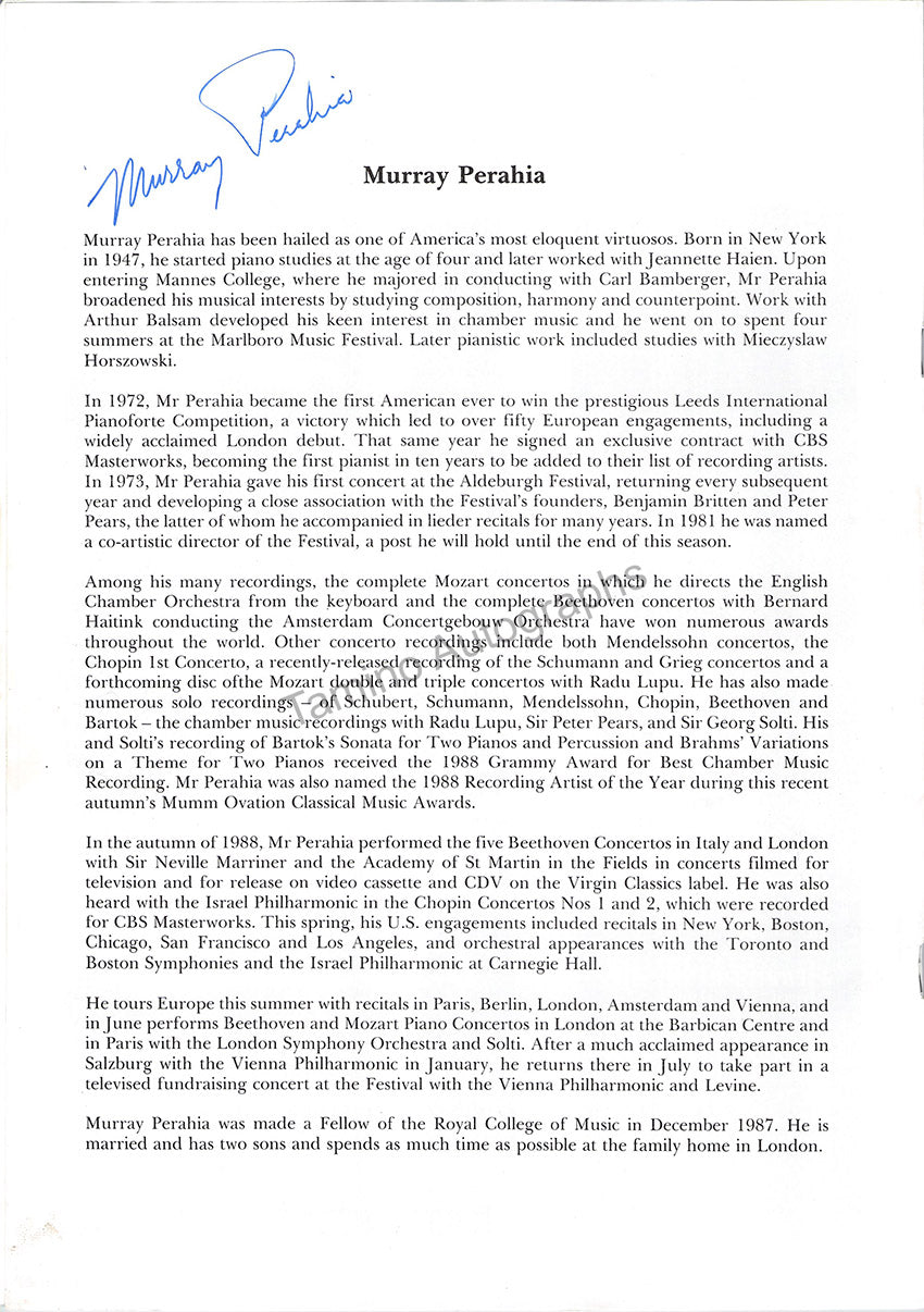 Perahia, Murray - Signed Program London 1989 Perahia, Murray - Signed Program London 1989 Perahia, Murray - Signed Program London 1989
