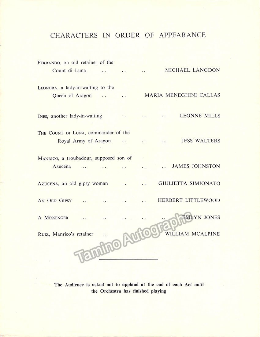 Performance program in Il Trovatore at the Royal Opera House, London, June 26, 1953, with Maria callas as Leonora. Full program insert, 4 pages, sized 7.1 x 8.25 inches, in excellent condition.