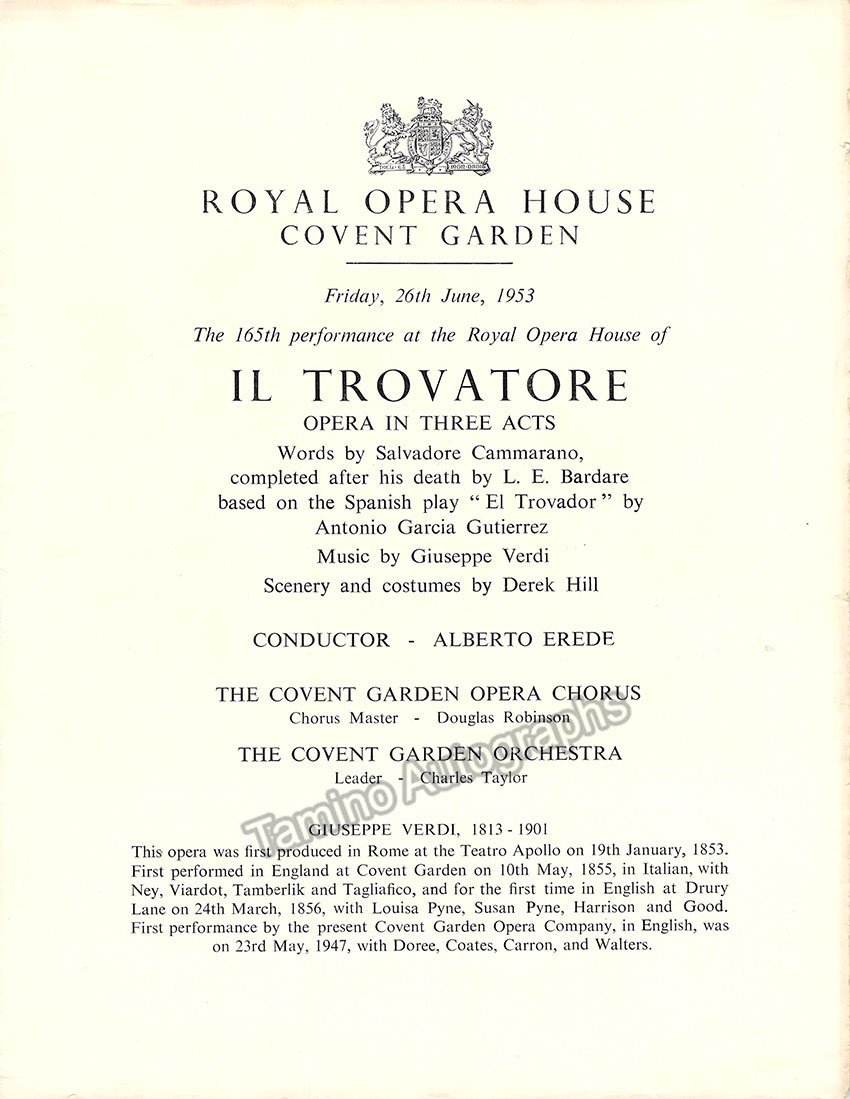 Performance Program "Il Trovatore" Royal Opera House 1953 - Tamino Performance Program "Il Trovatore" Royal Opera House 1953 - Tamino