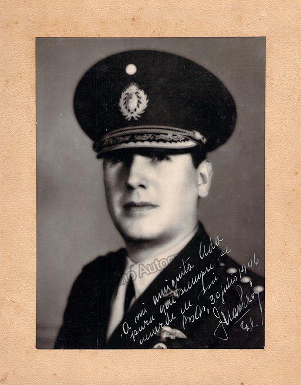 Signed photograph shown young, inscribed with a short sentiment, dated in Buenos Aires, 1946, mounted on a mat; ink-stamped on verso by "Archivo Grafico de la Nacion".  Total size is 8.1 x 10.4 inches (actual photograph is 6.2 x 8.4 inches), small crack over the left margin of the mat, spotted rust stain on the mat, photograph is in excellent condition.