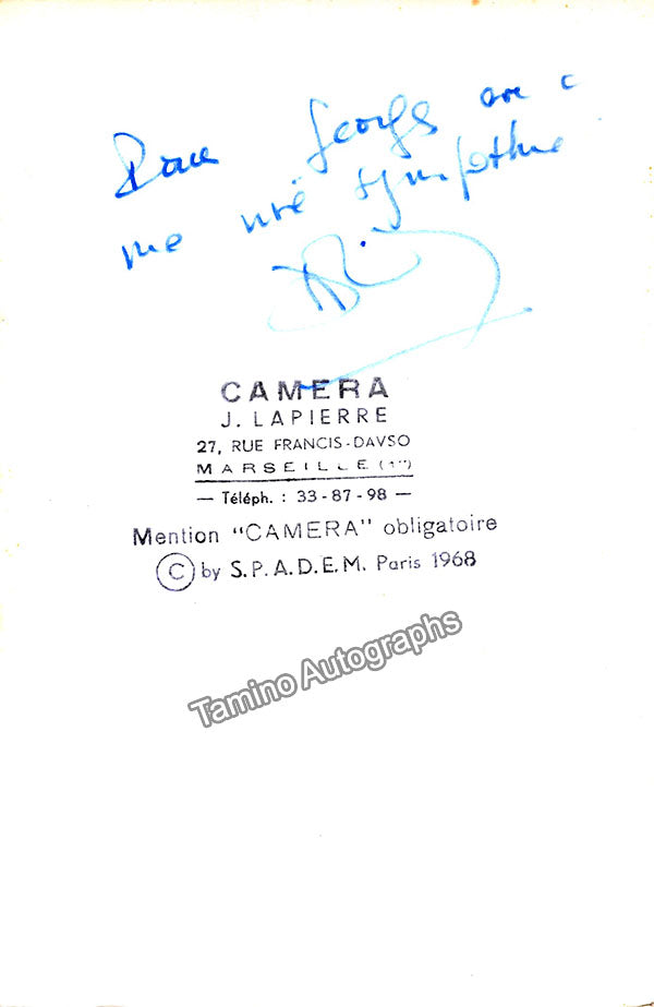 Signed publicity photograph, signed and inscribed on verso. Stamped on verso by photographer J. La Pierre, Camera studios, Marseille. Size is 4.5 x 7 inches, in excellent condition.