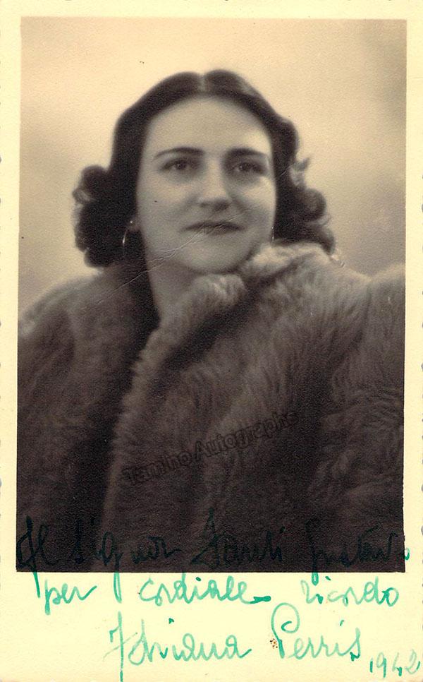 Italian soprano (1912-1983), signed photo postcard, shown as herself. Inscribed with clear signature dated in 1942. Stamped on verso by photography studio Foto Materiale, Como. Size is 3.25 x 5.25 inches, in excellent condition.