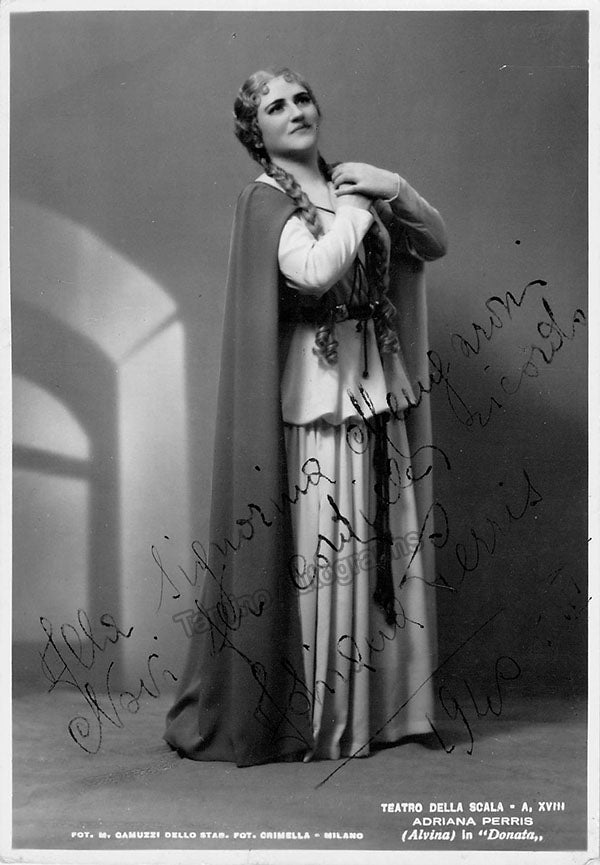 Italian soprano (1912-1983), signed photograph, shown as Alvina in Gaspare Scuderi's opera Donata at La Scala, Milan, inscribed. Photo by M. Camuzzi, La Scala, Milan. Size is 4 x 5.75 inches, in very good condition.
