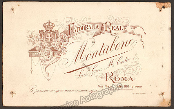 Very attractive signed vintage photograph mounted onto a cabinet, shown most likely as Scarpia in Puccini's Tosca, inscribed in Rome, dated in 1902. Bold handwriting and signature. Photo size is 5 x 7.5 inches mounted onto larger cabinet designed by Montabone, Rome. Total item size is 5.25 x 8.5 inches, four small bullet holes not affecting image and signature, otherwise in excellent condition.