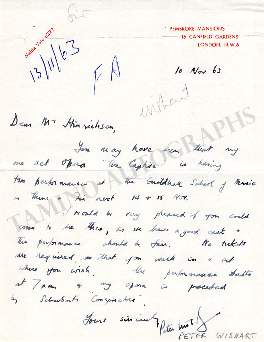 Autograph letter in English signed by him, dated Nov. 10, 1963, to Ms. Carla Hinrichsen widow of the German music publisher Henri Hinrichsen, informing her on the staging of his opera The Captive (1960) which: “....is having two performances at the Guildhall School of Music (...) I would be very pleased if you could come to see this as we have a good cast & the performance should be fair...”.