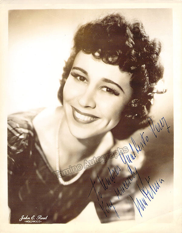 Signed publicity photograph, shown as herself, inscribed and dated in 1954. Printed signature on front of photographer James Abresch, New York. Size is 8 x 9.5 inches, in excellent condition.