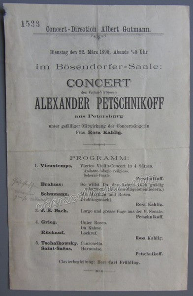 Vienna, Bosendorfer-Saal, 22. March 1898. Alexander Petschnikoff, Violin. Rosa Kahlig, Gesang. Vieuxtemps: Violin concerto 4. Bach: Largo and Grosse Fuge. Tschaikowsky: Canzonetta. Saint-Saens: Havanaise. Songs of - Brahms - Schumann - Grieg €š¬œ Ruckauf. 23,5 x 15 cm. 1 Page