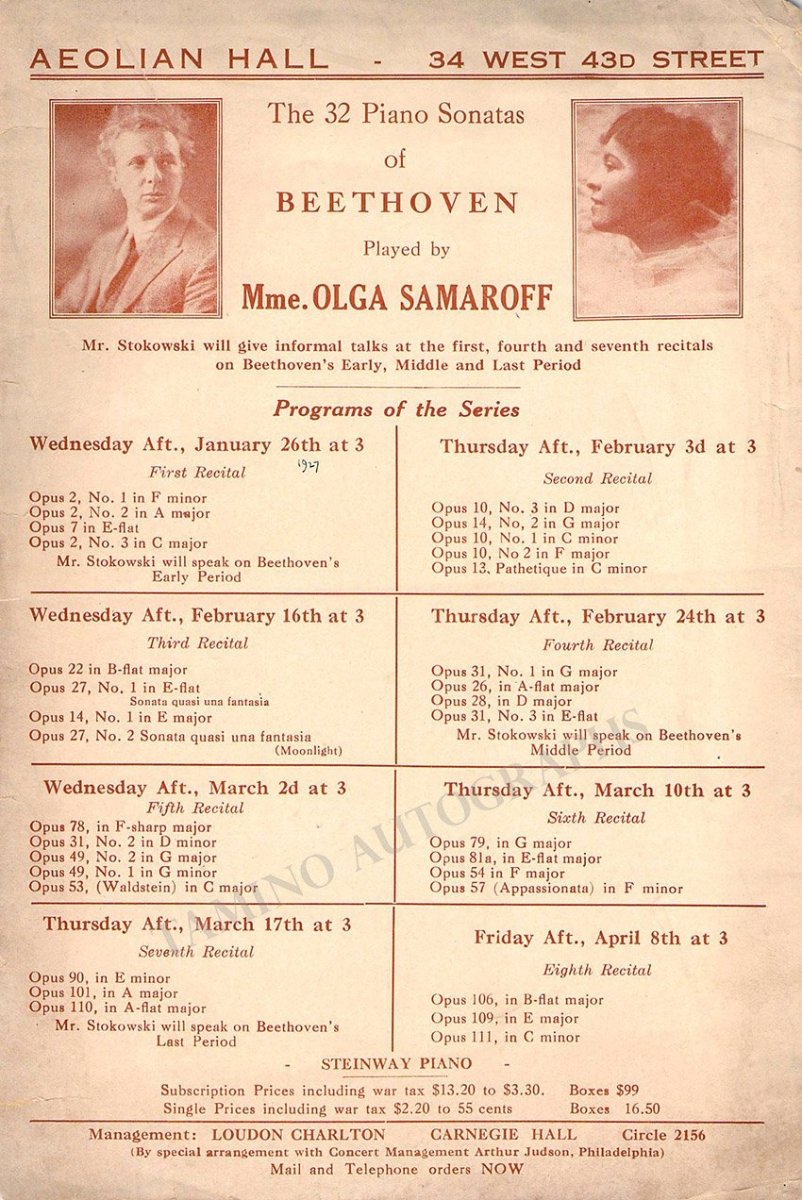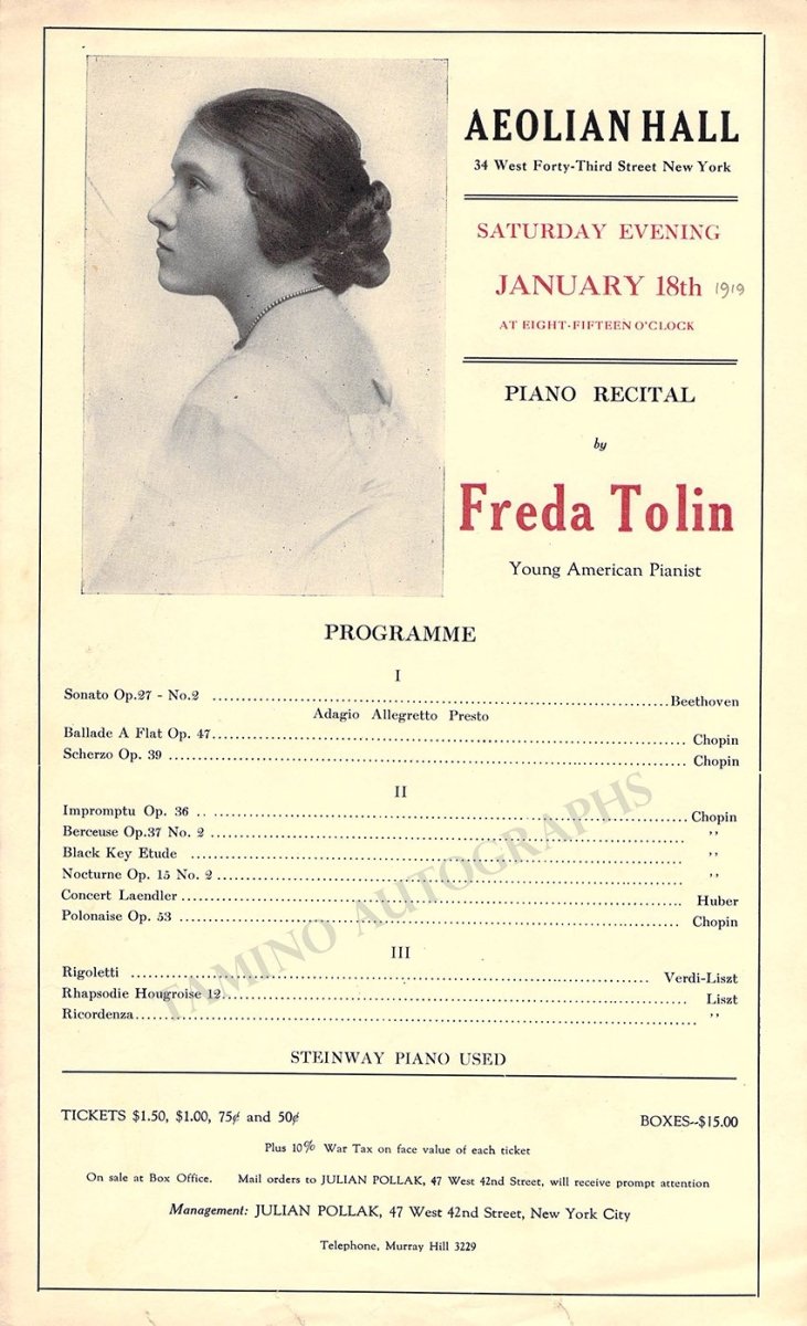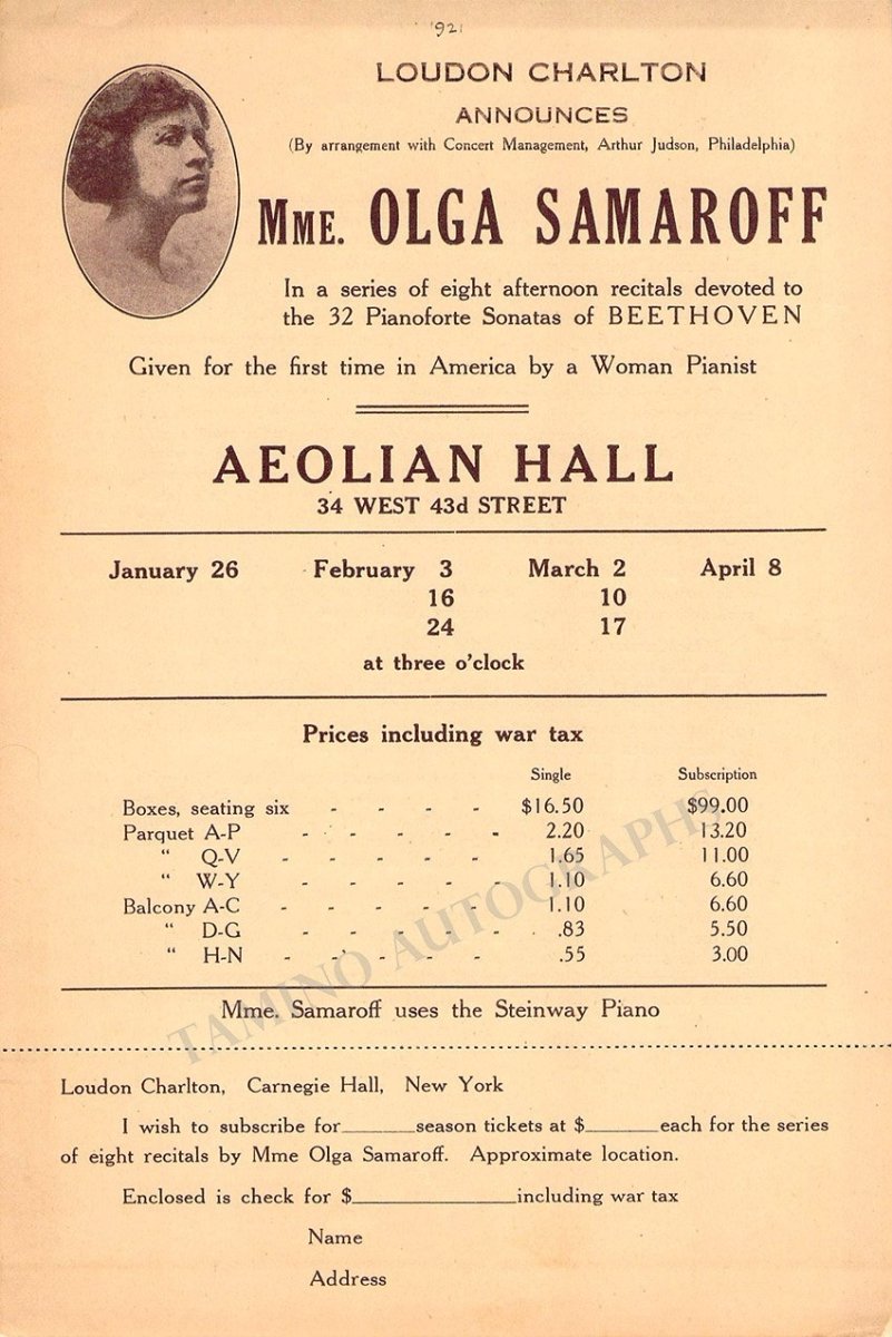 Group of 9 items, including 1 program and 8 playbill announcements for concerts in New York, at Aeolian Hall, Carnegie Hall and Town Hall. Artists include Olga Samaroff, Ignaz Friedman, Ernest Schelling, Freda Tolin, Ossip Gabrilowitsch, Harold Bauer, Tamara Lubimova.